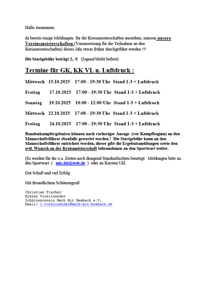 am Samstag den 12.07.2025 um 15:00 Uhr findet unser traditionelles Königsschießen statt. Die Ausschreibung findet sich in der Anlage. Die Startgebühr beträgt 5,-€